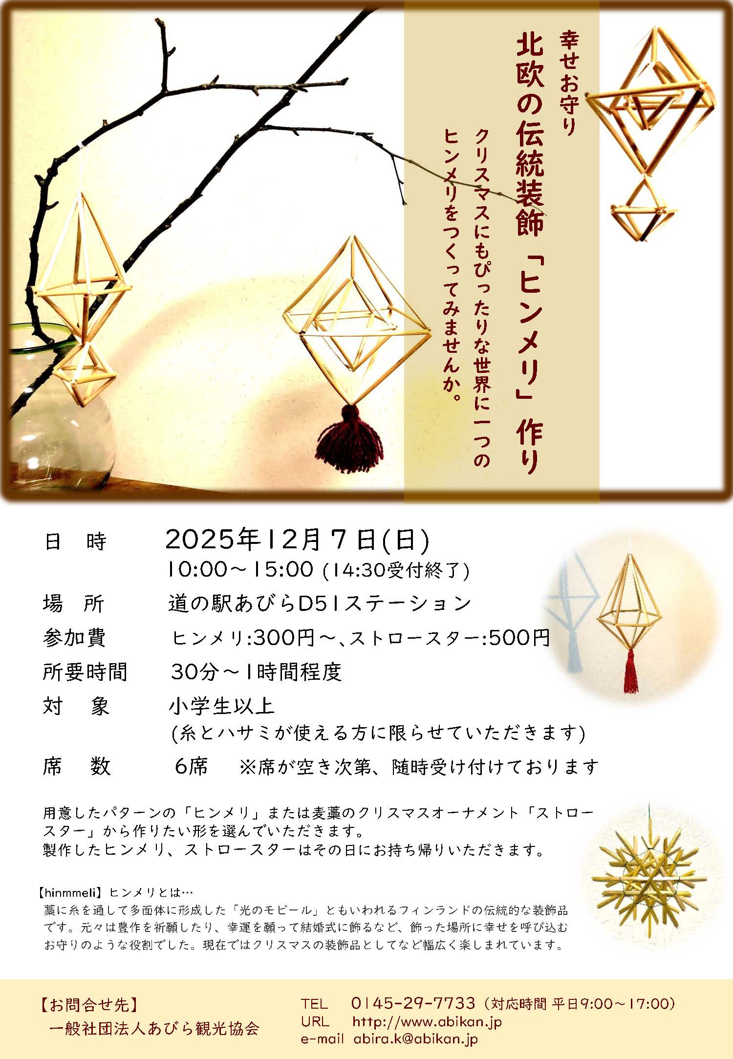 12月7日(日)に「道の駅あびらD51ステーション」にて「ヒンメリ」作り体験を開催します!