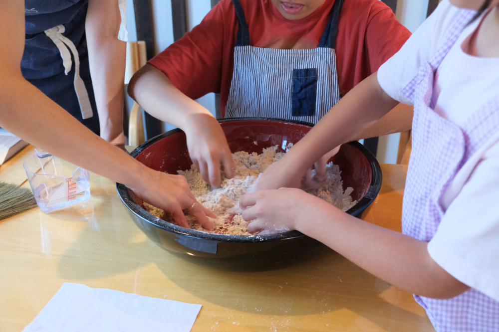そば粉は前日に挽いて準備していただいた新そばを使用。この工程からすでにそばのいい香りが漂います。