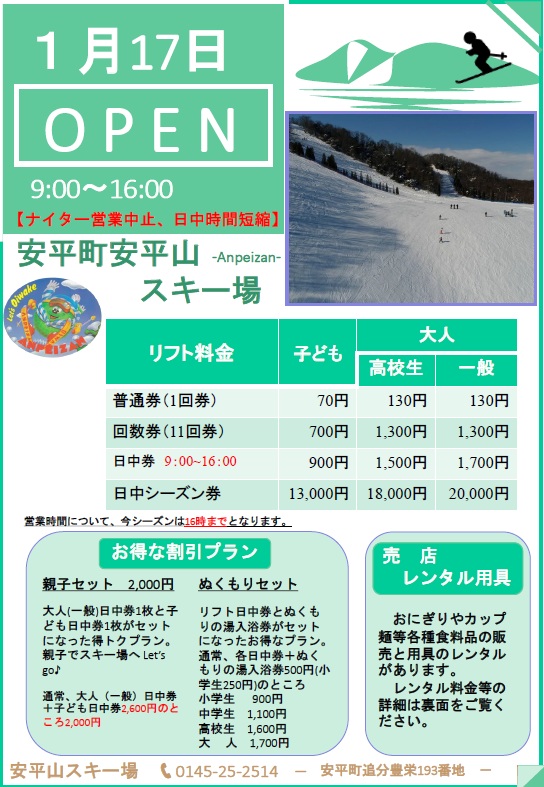 安平山スキー場が、令和8年1月17日から営業開始となります。